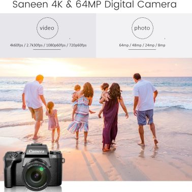 Saneen Digital Camera, 4k Cameras for Photography & Video, 64MP WiFi Touch Screen Vlogging Camera for YouTube with Flash, 32GB Card, Lens Hood, 3000mAH Battery, Front and Rear Cameras – Black